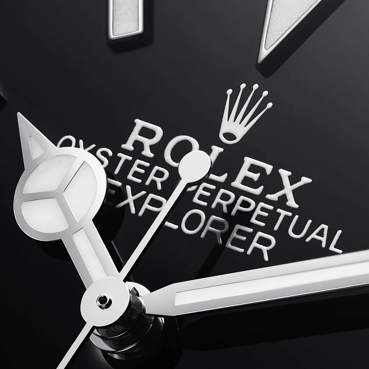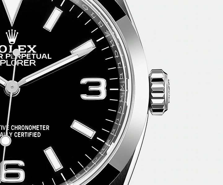 ダイアルは高い独自性と視認性を誇る ロレックスの顔である。最新のエクスプローラーモデルにはアワーマーカーや針と同様 特徴的な 3 6 9 の数字にも青い光を放つ長時間発光のルミネッセンスが採用されている。設計から製造まで完全自社開発。ロレックスのダイアルは 完璧を期すためほぼすべての工程が手作業で行われる。