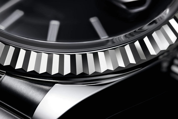 ロレックス フルーテッドベゼルは 卓越性の象徴。元来 オイスターベゼルの刻みにはベゼルをケースにねじ込み 時計の防水性能を確実にする機能的な目的があった。したがって その刻みはバックケースにも施されており 防水性能の維持という同じ理由で ロレックス独自のツールを用いてケースにねじ込まれていた。時を経て ベゼルの刻みはデザインの要素となり ロレックスのシンボルとなった。現在 フルーテッドベゼルは卓越性の象徴であり ゴールドのみで製造されている。