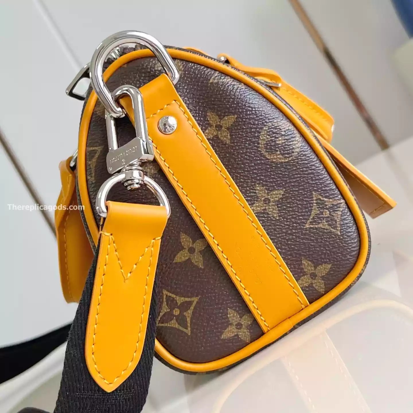 象徴的なルイ・ヴィトンのキーポル・バンドリエール 25 バッグ(サフラン イエロー モノグラム マカサー)をご覧ください。