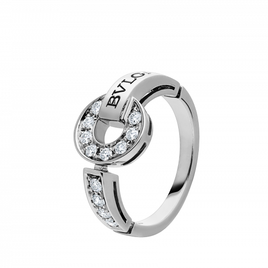 ブルガリ・ブルガリ リングは、18K ローズゴールド素材で作られ、ダイヤモンドのインレイで飾られています。