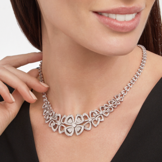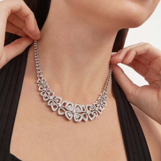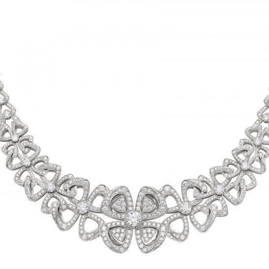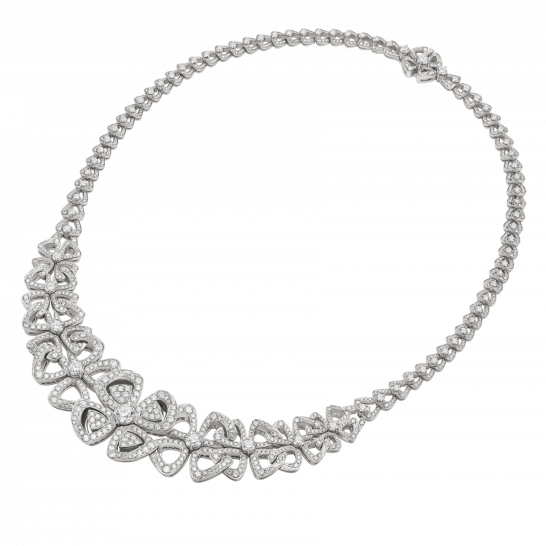 永遠の都ローマの壮麗な建造物群に、鮮やかに咲き誇るFIOREVERシリーズ。ローマ人が愛した、愛らしい4枚の花びらを持つ花からインスピレーションを得たデザインです。この花は幸福と喜びの象徴です。FIOREVERは、豊かな意味を持つ2つの言葉、「FIORE(イタリア語で花)」と「FOREVER(英語で永遠)」から成り、情熱的で大胆なデザインでローマ人の生命愛を称えています。高貴でクラシックな花柄は、高品質のダイヤモンドで作られた花冠に収められ、永遠の輝きを放ちます。FIOREVERシリーズの18Kホワイトゴールドネックレスは、ラウンドブリリアントカットダイヤモンドとパヴェダイヤモンドがセットされています。