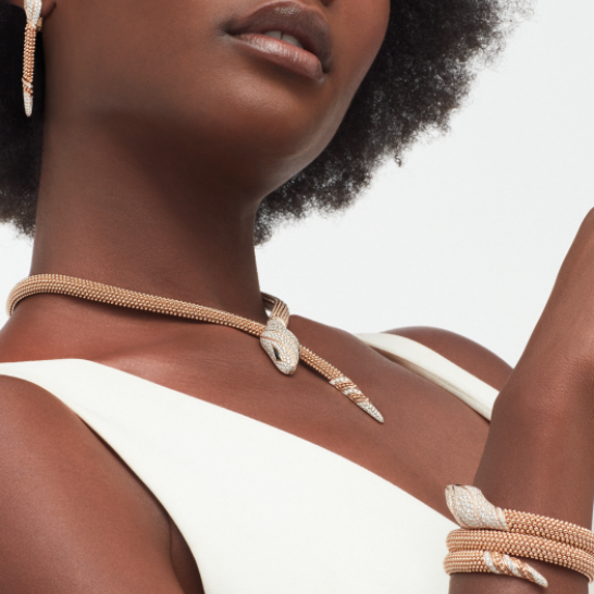 18Kローズゴールドネックレス「SERPENTI」シリーズは、ブルガリの名作が持つ絶え間ない変遷を独自のアプローチで解釈し、革新的な職人技、クラシックなデザイン、そして大胆な創造性の絶妙な融合を余すところなく表現しています。貴重な蛇の胴体は、取り外し可能な小さなゴールドビーズを手作業で丁寧に作り上げられ、ジュエリーにリズム感と魅力的なタッチを添えています。魅力的な蛇の頭部と曲がりくねった尾には、パヴェダイヤモンドが優雅にセッティングされています。