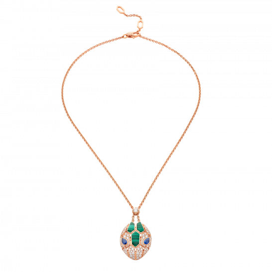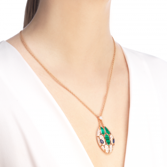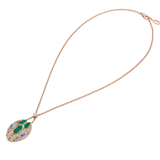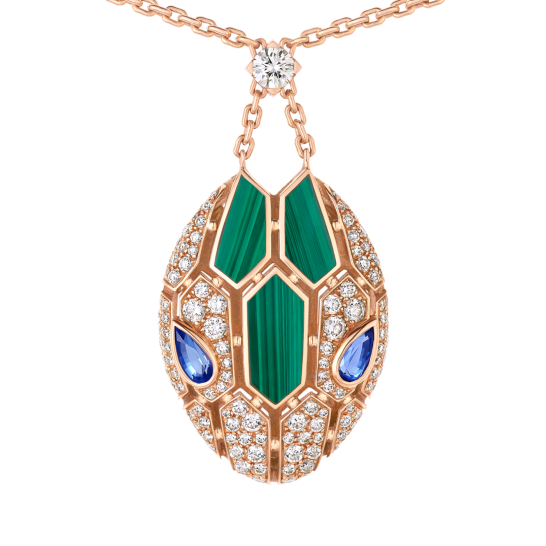 SERPENTIシリーズのブレスレットは、蛇の自然な魅力を捉え、魔法のような蛇の頭の魅力的な気質を表現し、大胆なスタイルと無限の魅力を融合させています。ブルガリは、女性の動く瞳からインスピレーションを得て、蛇の魅力的なポーズを再解釈し、瞳の間の魅惑的な魅力と抗えない気質に焦点を当てています。エレガンスと洗練さの中に、どこか危険な雰囲気を漂わせています。SERPENTIシリーズの18Kローズゴールドネックレスには、ブルーサファイア、マラカイト、パヴェダイヤモンドがセットされています。