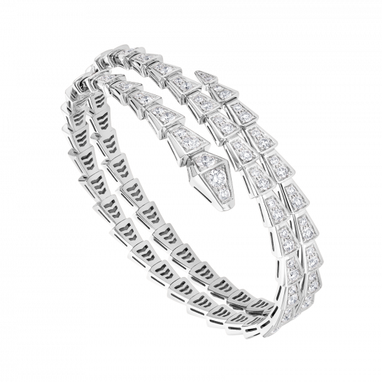 ダイヤモンドのインレイがあしらわれたSERPENTI VIPERシリーズのホワイト18Kゴールドダブルループブレスレット。