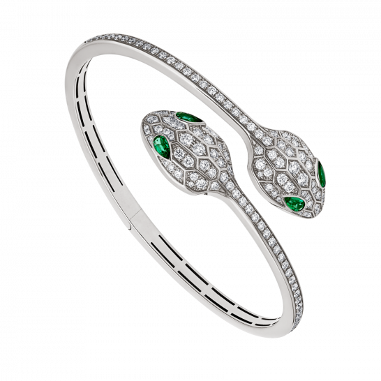 SERPENTIシリーズのブレスレットは、蛇本来の魅力を捉え、魔力を持つ蛇の頭の魅力的な気質を表現し、大胆なスタイルと無限の魅力を融合させています。ブルガリは、女性の魅惑的な瞳からインスピレーションを得て、精霊蛇の魅力的な立ち居振る舞いを再解釈し、瞳の間の魅惑的な魅力と抗えない気質に焦点を当てています。エレガントで優美でありながら、どこか危険な雰囲気を漂わせています。SERPENTIシリーズのホワイト18Kゴールドブレスレットは、エメラルドをセッティングし、緻密なダイヤモンドで装飾されています。