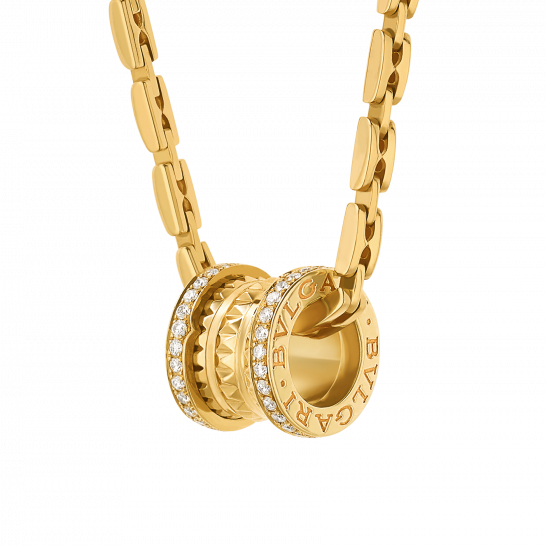 B.ZERO1 ROCKシリーズの18Kローズゴールドネックレスは、有名な円形闘技場コロッセオからインスピレーションを得ており、ブルガリの大胆で奔放な創造的視点を革新的な方法で表現しています。このシリーズのクラシカルでピュアなスパイラルシェイプは、ペンダントのシャープで力強いラインを通して表現され、ゴールドのスタッドによって新たな解釈が加えられています。エッジには貴重なダイヤモンドがパヴェセッティングされ、この革新的なデザインの傑作の奔放な個性を際立たせています。
