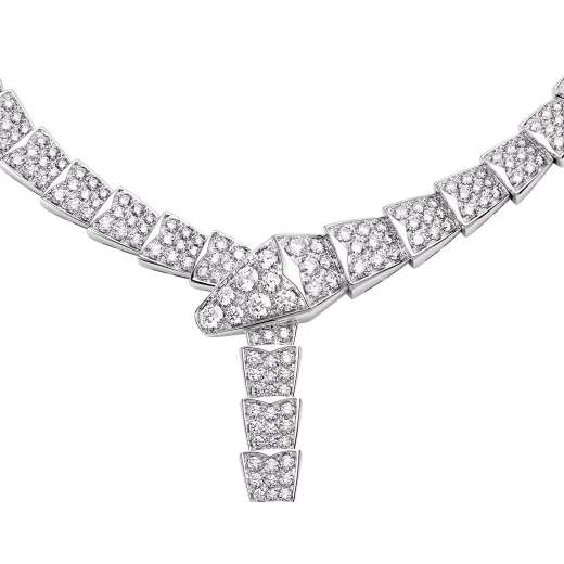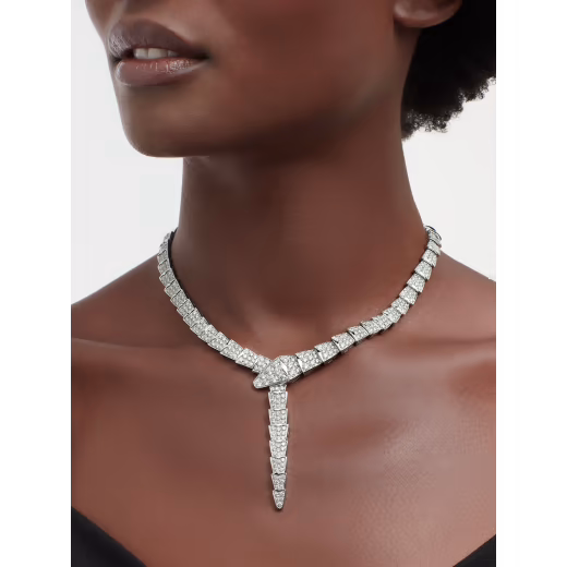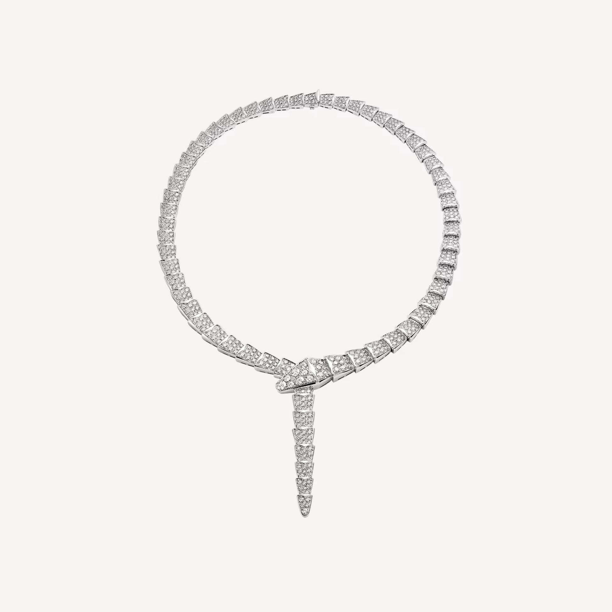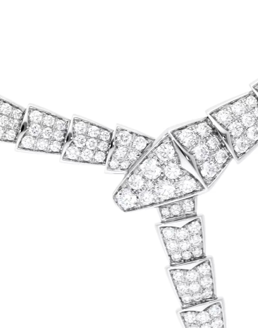 ブルガリは、スピリットアニマルである蛇へのオマージュとして、このセルペンティ ネックレスで魅惑の力を体現しました。官能的な魅力と誘惑を、催眠術的なデザインで包み込みます。洗練されたグラマラスなこのジュエリーは、首に巻きつき、鱗の貴重さと蛇特有のしなやかさが際立ちます。