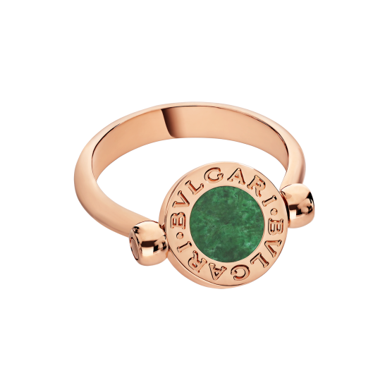 ブルガリ ブルガリ フリップ リングは、18K ローズ ゴールド素材で作られ、マザー オブ パール シェルとオニキスがセットされています。