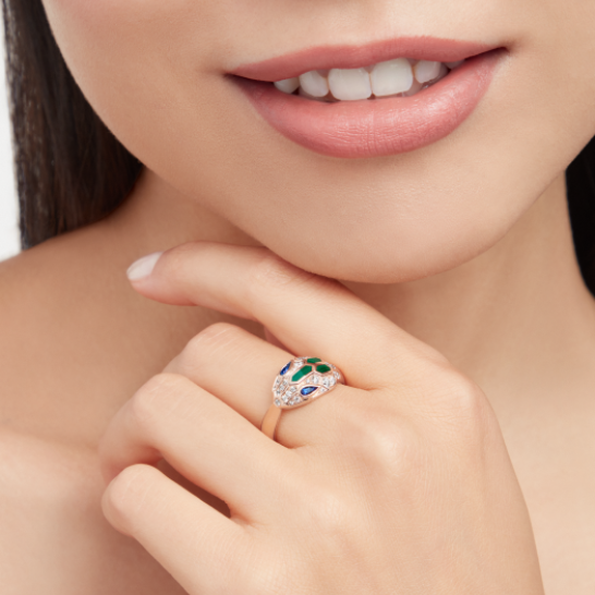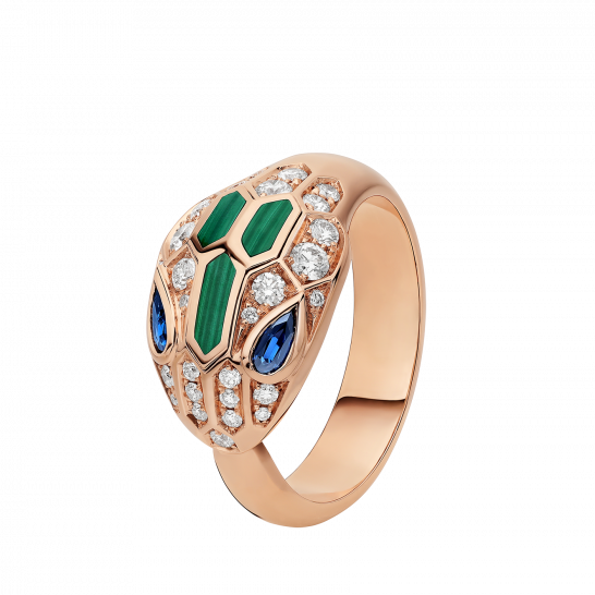 SERPENTIシリーズのリングは、精霊の蛇の自然な魅力を捉え、魔法の蛇の頭の魅力的な気質を表現し、大胆なスタイルと無限の魅力を融合させています。ブルガリは、女性の動く瞳からインスピレーションを得て、蛇の魅力的なポーズを再解釈し、瞳の間の魅惑的な魅力と抗えない気質に焦点を当てています。エレガンスと洗練さの中に、どこか危険な雰囲気を漂わせています。SERPENTIシリーズの18Kローズゴールドリングには、ブルーサファイア、マラカイト、パヴェダイヤモンドがセットされています。