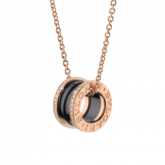 B.ZERO1ネックレスは、世界的に有名な円形闘技場、コロッセオからインスピレーションを得ており、ブルガリの創造性を真に体現し、ジュエリーデザインの真髄に挑戦しています。その独特のピュアな螺旋形は、永遠の都ローマの壮麗さに映し出される過去、現在、未来の調和のとれた繋がりと、コレクションのパイオニア精神を象徴しています。B.ZERO1シリーズのペンダントは、18Kローズゴールドとブラックセラミック製で、縁にはパヴェダイヤモンドがあしらわれています。長さ38~45cm(14.96~17.70インチ)