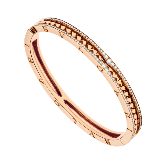 B. ZERO1 ROCKシリーズのブレスレットは、ローマのコロッセオという有名な円形野外劇場からインスピレーションを得ており、ブルガリの大胆で奔放な創造的視点を先駆的な方法で表現しています。このシリーズのクラシックな螺旋デザインは、力強く際立つラインを特徴としており、ゴールドのスタッドで新たな解釈を加え、縁には貴重なダイヤモンドがセッティングされています。革新的なデザインの傑作であるこのブレスレットの奔放な性質を際立たせています。