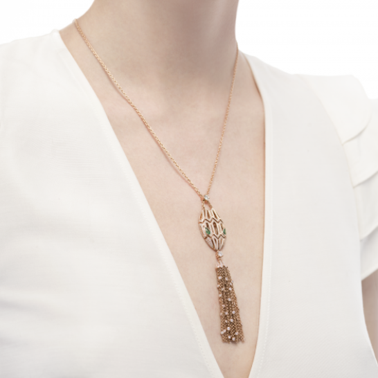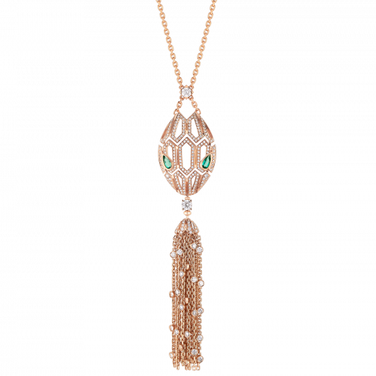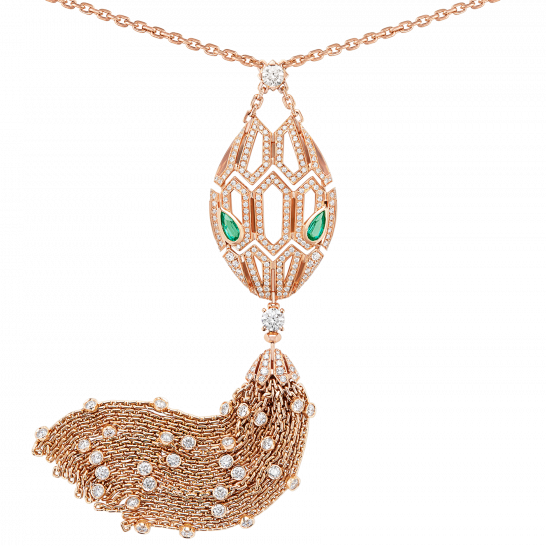 セルペンティ ネックレスは魅力に溢れています。宝石をちりばめた美しい蛇の頭が、魅力と光で輝きます。巧みなタッセルのディテールデザインは、霊的な蛇の広がりと曲線を描く姿勢を表現しています。ブルガリは、女性の動く瞳からインスピレーションを得て、霊的な獣を再解釈し、瞳の魔力を際立たせています。官能的で魅力的で、抗えない魅力を放ちます。18Kローズゴールドのセルペンティ タッセルネックレス。エメラルドとパヴェダイヤモンドがあしらわれています。