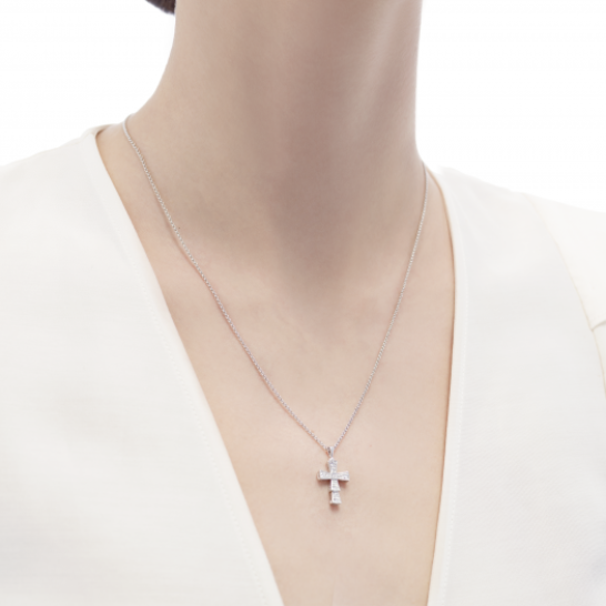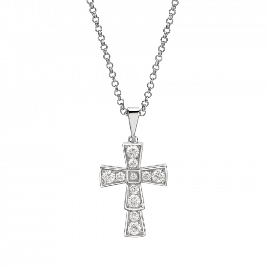 十字架の模様は、古代エジプトから現代に至るまで、人類の長い歴史と深く結びつき、多様で深い意味を持つシンボルです。ブルガリはこの伝統的なシンボルを、高貴で輝くダイヤモンドで再解釈しました。「CROCE」シリーズのペンダントは、まるで大切なお守りのように、首元で永遠に大切に身に着けられます。「CROCE」ペンダント(スモールサイズ)は、18Kホワイトゴールド製で、パヴェダイヤモンド(0.31カラット)があしらわれています。