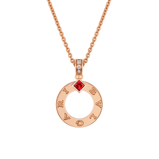 ブルガリ ブルガリ シリーズの 18K ローズ ゴールド チェーンとペンダント、ルビーがセットされています。