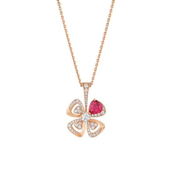 FIOREVER シリーズのネックレスは、18K ローズ ゴールド製で、ブリリアント カット ダイヤモンド、ファンシー カット ルベライト、パヴェ ダイヤモンドがセットされています。