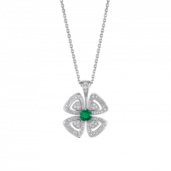 FIOREVER シリーズの 18K ホワイト ゴールド ネックレス。中央にブリリアントカットのエメラルド (0.30 カラット) がセットされ、パヴェ ダイヤモンド (0.31 カラット) で装飾されています。
