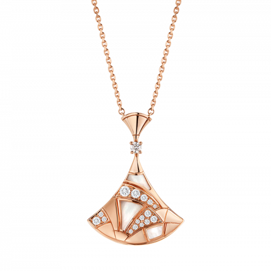 DIVAS' DREAMネックレスは、女性のエレガンスと永遠の都ローマの魅力的な雰囲気からインスピレーションを得ており、独特のローマ精神を持つ最も魅力的な女性たちに敬意を表しています。フェミニンで洗練されたこのネックレスは、カラカラ浴場の大理石の美しさと扇形モザイクの魅力的な曲線を反映し、イタリアの美学の真髄を体現しています。DIVAS' DREAMシリーズのネックレスは、18Kローズゴールド製で、マザーオブパールの象嵌とパヴェダイヤモンドがあしらわれています。