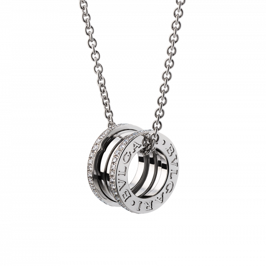 B.ZERO1ネックレスは、世界的に有名な円形闘技場、コロッセオからインスピレーションを得ており、ブルガリの創造性を真に体現し、ジュエリーデザインの真髄に挑戦しています。独特のピュアな螺旋形は、永遠の都ローマの壮麗さに映し出される過去、現在、未来の調和のとれた繋がりと、コレクションのパイオニア精神を象徴しています。B.ZERO1シリーズのペンダントは、18Kホワイトゴールド製で、縁にはパヴェダイヤモンドがあしらわれています。長さ38~45cm。