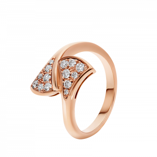 ディーヴァズ ドリームシリーズのリングは、イタリアのエレガンスと魅力を体現し、ミステリアスで忘れられない気質を持つ女性の力を解き放ちます。ローマのカラカラ浴場のモザイク装飾にインスピレーションを得た扇形の模様が、チャーミングで優美なリングを彩ります。ブルガリと「永遠の都」ローマの歴史的な繋がりを、モダンなファッションデザインと絶妙な宝石の組み合わせを通して表現しています。ディーヴァズ ドリームシリーズの18Kローズゴールドリングは、精巧にセッティングされたダイヤモンドで彩られています。