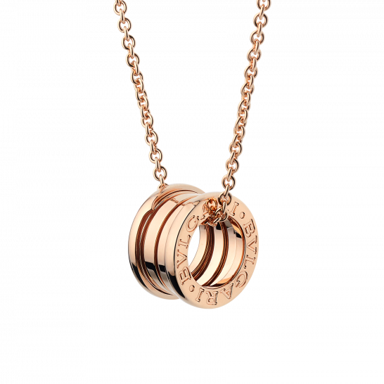 B.ZERO1ネックレスは、世界的に有名な円形闘技場、コロッセオからインスピレーションを得ており、ブルガリの創造性を真に体現し、ジュエリーデザインの真髄に挑戦しています。その独特のピュアな螺旋形は、永遠の都ローマの壮麗さに映し出される過去、現在、未来の調和のとれた繋がりと、コレクションのパイオニア精神を象徴しています。B.ZERO1シリーズ ラウンドペンダント(ネックレス付き)、スモールサイズ、18Kローズゴールド。直径1.50cm、長さ38~45cm。