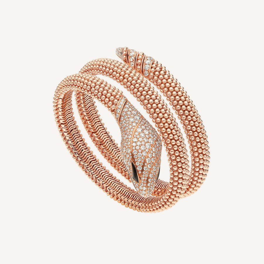 ローズゴールドのセルペンティ パリーニ ブレスレットには、パヴェダイヤモンドとブラックオニキスの目があしらわれています。