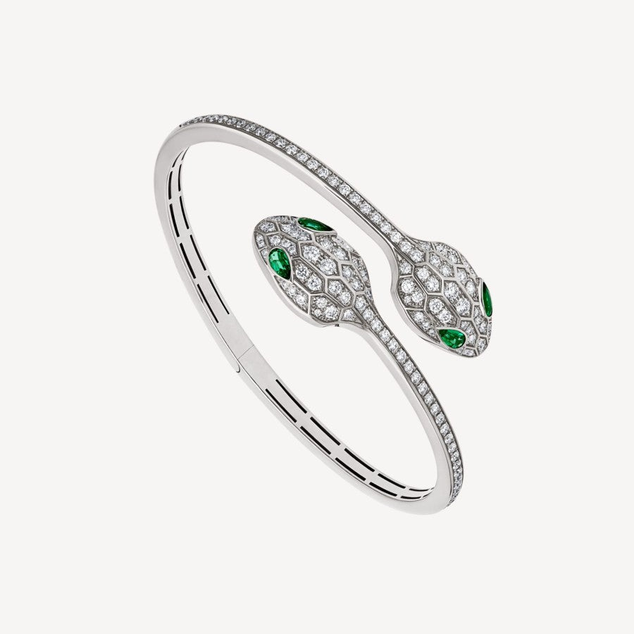 蛇の持つ魅力を捉えたセルペンティ ブレスレットは、神話上の動物の頭部を美しく表現し、大胆なスタイルと奔放な誘惑を融合させています。女性の官能的な視線にインスピレーションを得たブルガリは、蛇の魅惑的な魅力を再現。その瞳の磁力と、抗しがたい誘惑力、つまりエレガンスの中にどこか危険な雰囲気を漂わせる魅力に焦点を当てています。エメラルドとパヴェダイヤモンドをあしらった、18Kホワイトゴールドのセルペンティ ブレスレット。