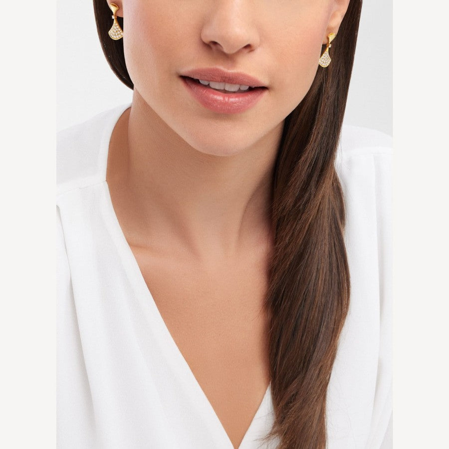 女性らしいエレガンスと永遠の都ローマの魅惑的な魅力にインスパイアされたディーヴァ・ドリーム・イヤリングは、紛れもないローマの精神を持つ、最も華やかなディーヴァたちへのオマージュです。真にフェミニンで洗練されたこのイヤリングは、カラカラ浴場の大理石の壮麗さと扇形モザイクの官能的な曲線を捉えた彫刻のように作られており、イタリアの美の真髄を反映しています。18Kイエローゴールドにダイヤモンドとパヴェダイヤモンドをセットしたディーヴァ・ドリーム・イヤリング。