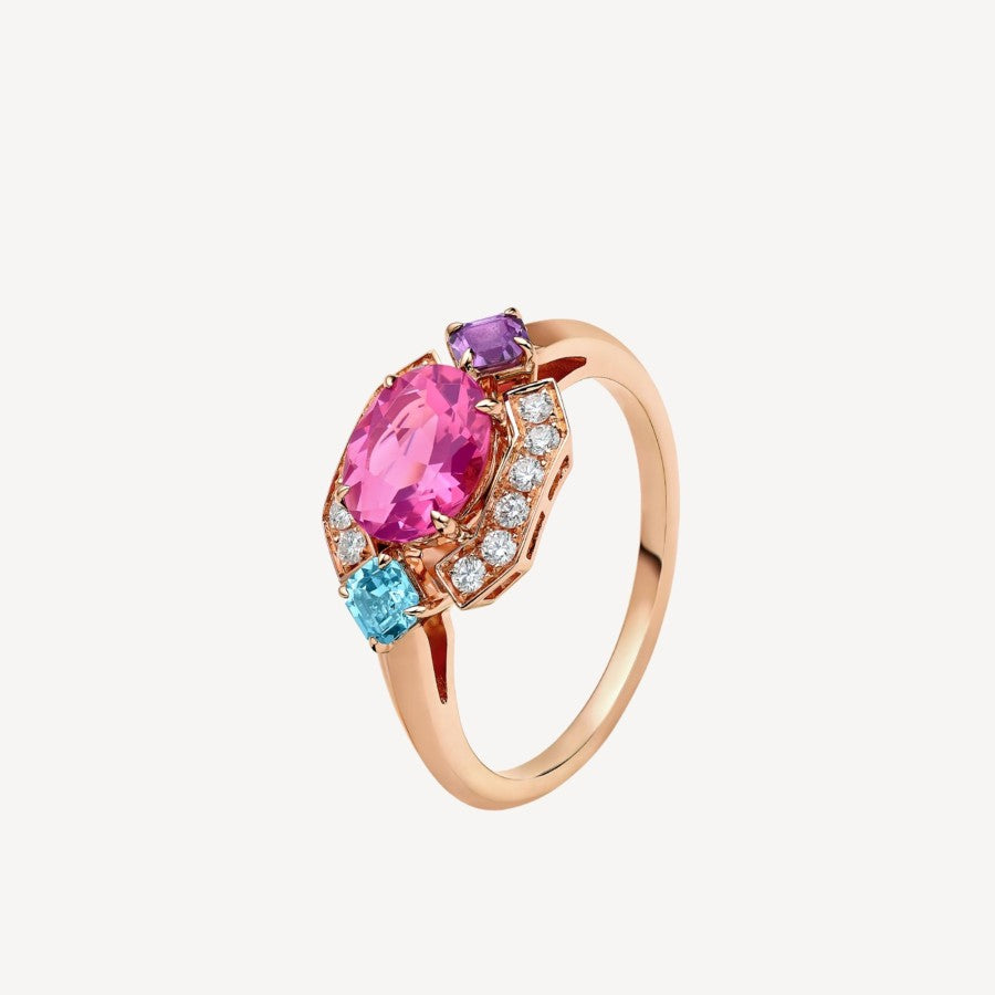 多彩なフォルムに輝く宝石を贅沢にあしらったアレグラ18Kローズゴールドリングは、ブルガリの鮮やかで大胆な色彩表現を体現しています。鮮やかなニュアンスを通して喜びを表現した、この躍動感あふれるジュエリーは、ピンクトルマリン、アメジスト、ブルートパーズを組み合わせ、パヴェダイヤモンドがきらめく調和のとれた幾何学模様を描き出しています。カット、シェイプ、カラー、そして光の相互作用が、現代女性の多様性を求めるニーズを満たします。18K