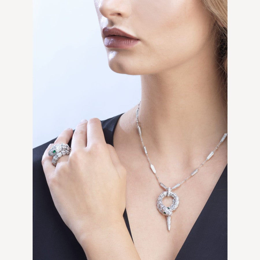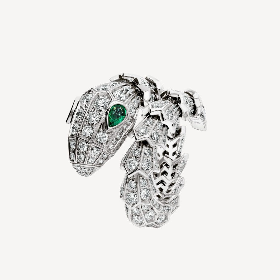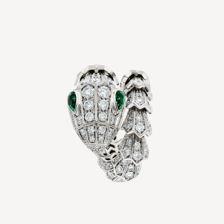 蛇の瞳とその磁力のような魅力を称えるセルペンティ リングは、魅惑的な官能的な輝きを放ちます。洗練されたグラマラスなジュエリーは、指に巻きつき、その鱗の美しさと蛇の独特の曲線が際立ちます。ブルガリのトレードマークである、魅惑的で魅惑的な2つのカラーストーンが、蛇の鋭い視線を称えています。パヴェダイヤモンドと2つのエメラルドの瞳をあしらったセルペンティ 18Kホワイトゴールド リング。
