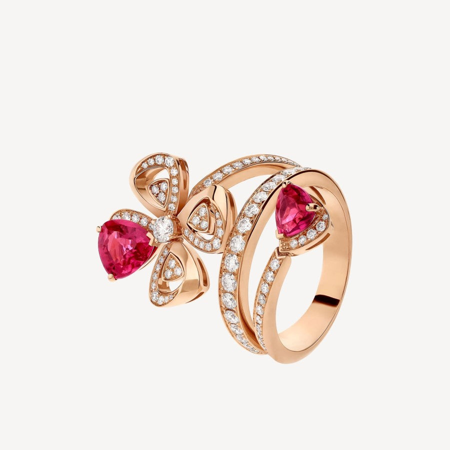 ブリリアントカットダイヤモンド、ファンシーカットとペアシェイプのルベライト、そしてパヴェダイヤモンドをあしらった18Kローズゴールドの「フィオレヴァー」リング。