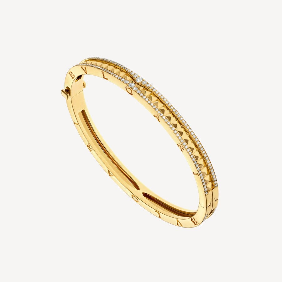 世界で最も有名な円形闘技場、コロッセオからインスピレーションを得た「ビー・ゼロワン ロック」は、ブルガリの創造的ビジョンを大胆に表現した、斬新なステートメントです。ジュエリー美学の真髄に挑戦する、特徴的なスパイラルはゴールドのスタッドで新たに解釈され、ブルガリの象徴的なデザイン精神である、妥協を許さない先見の明を際立たせています。パヴェダイヤモンドをあしらった18Kイエローゴールドの「ビー・ゼロワン ロック」ブレスレット。