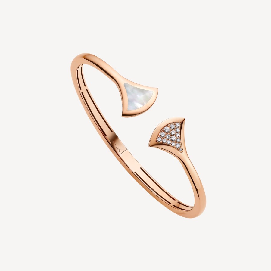 イタリアのエレガンスを体現するディーヴァ・ドリーム・ブレスレットは、神秘的で忘れられない魅力を持つディーヴァの伝説を表現しています。真にフェミニンで洗練されたこのブレスレットの扇形のモチーフは、ローマ帝国のカラカラ浴場のモザイクからインスピレーションを得ており、モダンなデザインと洗練された宝石の組み合わせを通して、ブルガリと永遠の都ローマとの揺るぎない絆を反映しています。マザーオブパールのインサートとパヴェダイヤモンドをあしらった、ディーヴァ・ドリーム18Kローズゴールドバングルブレスレット。