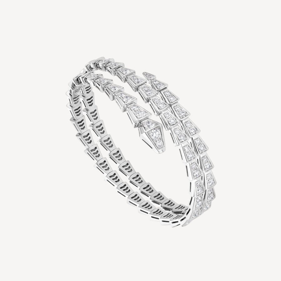 パヴェダイヤモンドをあしらった18Kホワイトゴールドのセルペンティ ヴァイパー ツーコイルブレスレット。