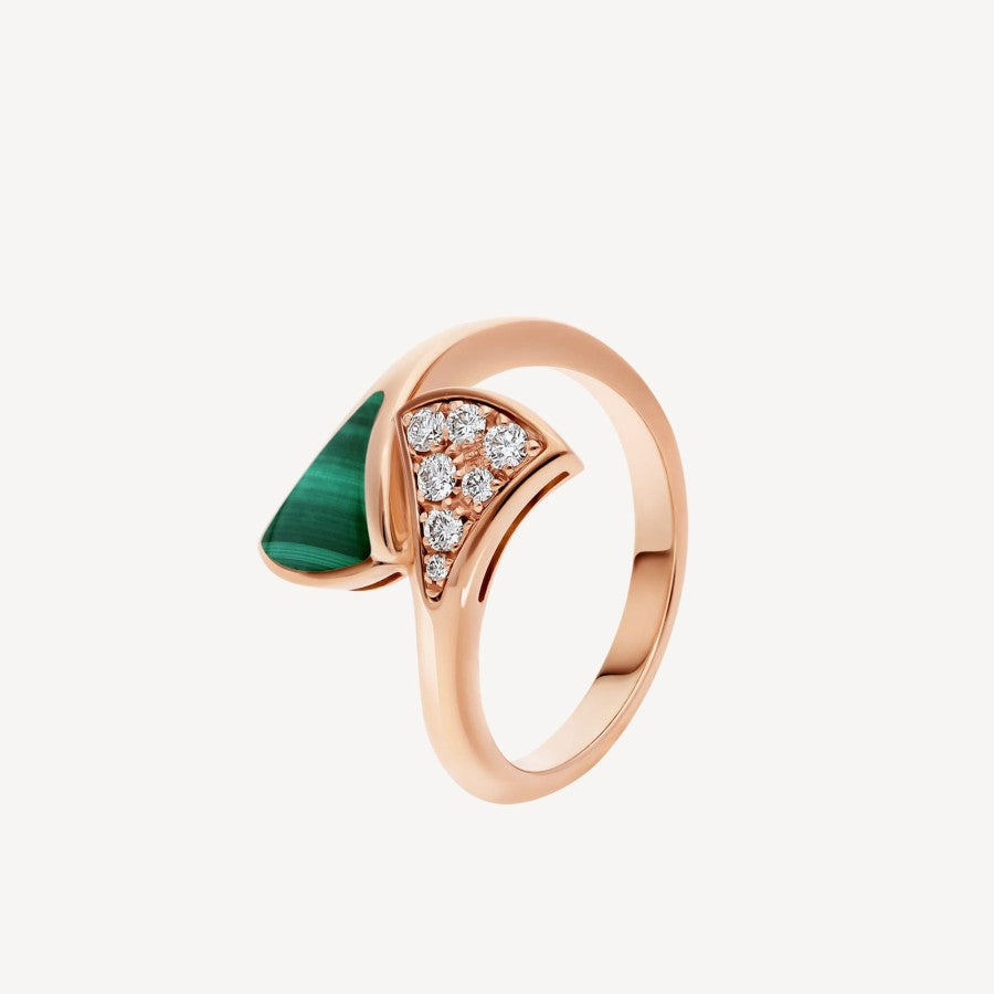 イタリアンエレガンスを体現するディーヴァズ ドリーム リングは、ミステリアスで忘れられない魅力を持つディーヴァの伝説を表現しています。真にフェミニンで洗練されたこのリングの扇形のモチーフは、ローマ帝国のカラカラ浴場のモザイクからインスピレーションを得ており、モダンなデザインと洗練された宝石の組み合わせを通して、ブルガリと永遠の都ローマとの揺るぎない絆を体現しています。マラカイトのインサートとパヴェダイヤモンドをあしらった、ディーヴァズ ドリーム 18Kローズゴールドリング。