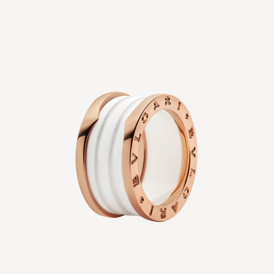世界で最も有名な円形闘技場、コロッセオからインスピレーションを得たビー・ゼロワン リングは、ブルガリの創造的ビジョンを真に体現し、ジュエリーデザインの真髄に挑戦しています。特徴的なスパイラルの純粋さは、永遠の都ローマの壮麗さに反映された過去、現在、そして未来の調和のメタファーであり、コレクションのパイオニア精神の象徴でもあります。18Kローズゴールドのループ2つとホワイトセラミックのスパイラルが特徴のビー・ゼロワン 4バンドリング。