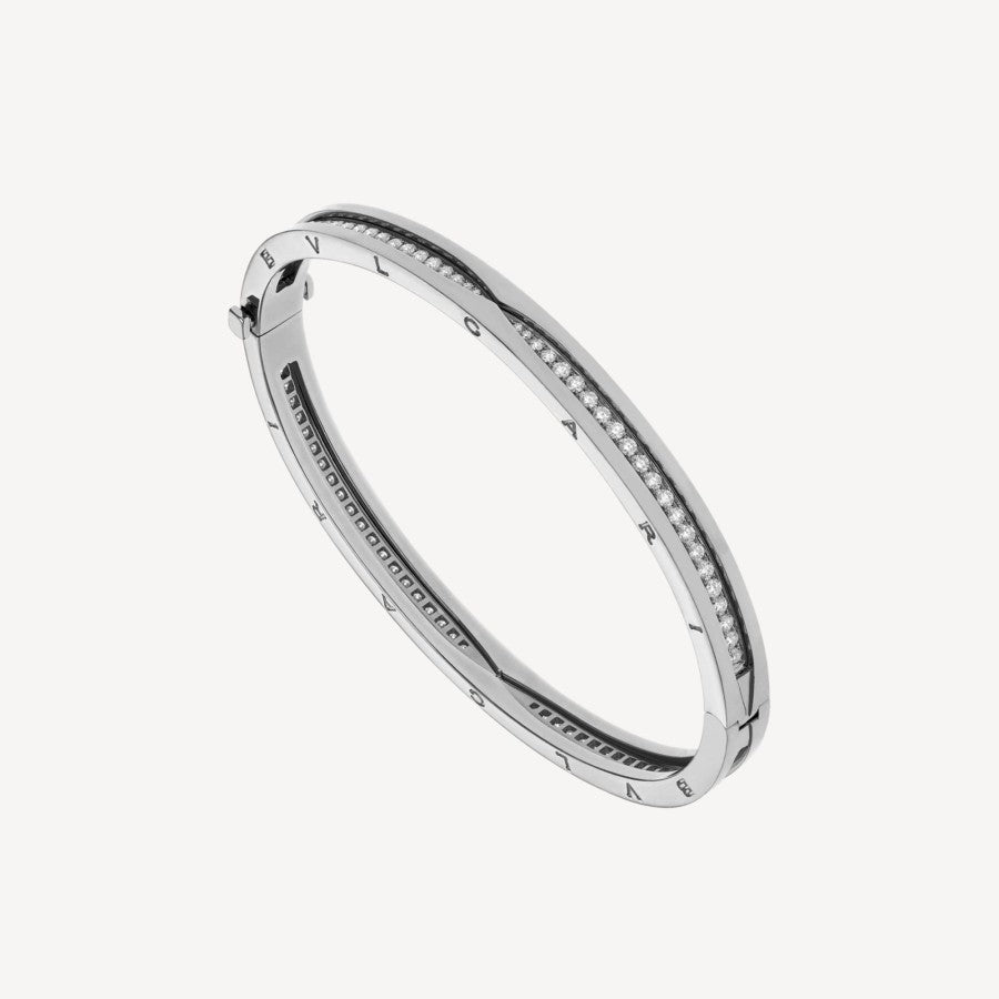 世界で最も有名な円形闘技場、コロッセオからインスピレーションを得たB.Zero1は、ブルガリの創造的ビジョンを革新的に表現した、イタリアンデザインの真のアイコンです。ジュエリー美学の真髄に挑戦するその特徴的なスパイラルは、永遠の都ローマの壮麗さに映し出された過去、現在、未来の調和のメタファーであり、コレクションのパイオニア精神を象徴しています。パヴェダイヤモンドをあしらった18KホワイトゴールドのB.Zero1ブレスレット。