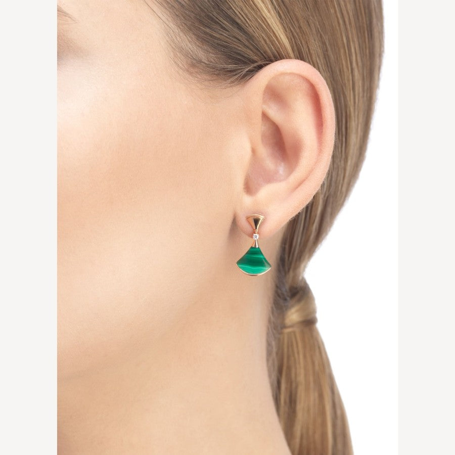 イタリアのエレガンスを体現するディーヴァズ ドリーム イヤリングは、ミステリアスで忘れられない魅力を持つディーヴァの伝説を体現しています。真にフェミニンで洗練されたこのリングの扇形のモチーフは、ローマ帝国のカラカラ浴場のモザイクからインスピレーションを得ており、モダンなデザインと洗練された宝石の組み合わせを通して、ブルガリと永遠の都ローマとの揺るぎない絆を反映しています。マラカイトのインサートとラウンドブリリアントカットダイヤモンドをあしらった、ディーヴァズ ドリーム 18Kローズゴールドイヤリング。