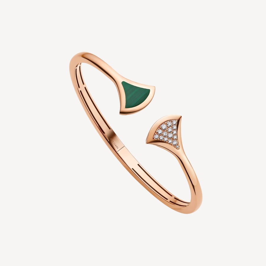 イタリアンエレガンスを体現するディーヴァズドリームブレスレットは、ミステリアスで忘れられない魅力を持つディーヴァの伝説を表現しています。真にフェミニンで洗練されたこのブレスレットの扇形のモチーフは、ローマ帝国のカラカラ浴場のモザイクからインスピレーションを得ており、モダンなデザインと洗練された宝石の組み合わせを通して、ブルガリと永遠の都ローマとの揺るぎない絆を反映しています。マラカイトインサートとパヴェダイヤモンドをあしらったディーヴァズドリーム18Kローズゴールドバングルブレスレット。