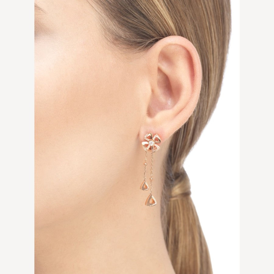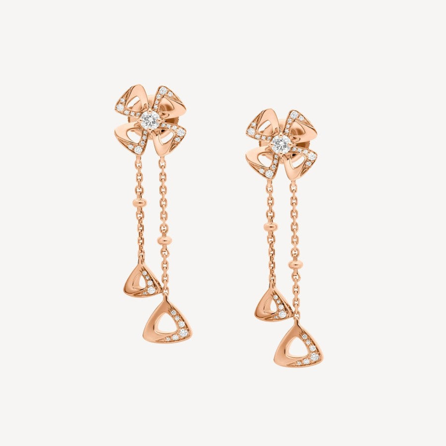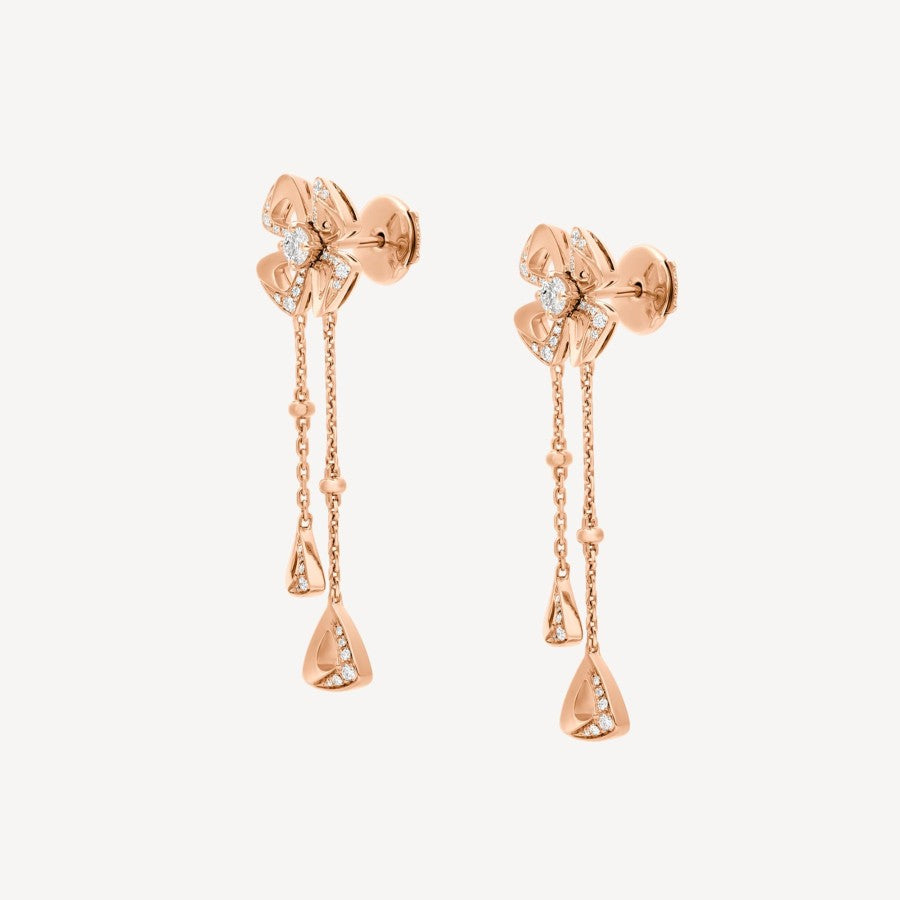 永遠の都ローマの壮麗な建造物群の間に咲き誇るフィオレヴァーは、ローマ人が幸福と喜びの象徴として大切にしていた魅惑的な四弁の花からインスピレーションを得ています。「フィオーレ」(イタリア語で「花」)と「永遠」という二つの意味深い言葉を融合させたフィオレヴァーは、自由奔放で情熱的なデザインで、ローマ人の生命への愛を称えます。永遠の輝きを放つこの貴重な花の象徴は、最高品質のダイヤモンドの花冠で丁寧に作られています。18Kローズゴールドにラウンドブリリアントカットダイヤモンド2個とパヴェダイヤモンドをあしらったフィオレヴァーペンダントイヤリング。