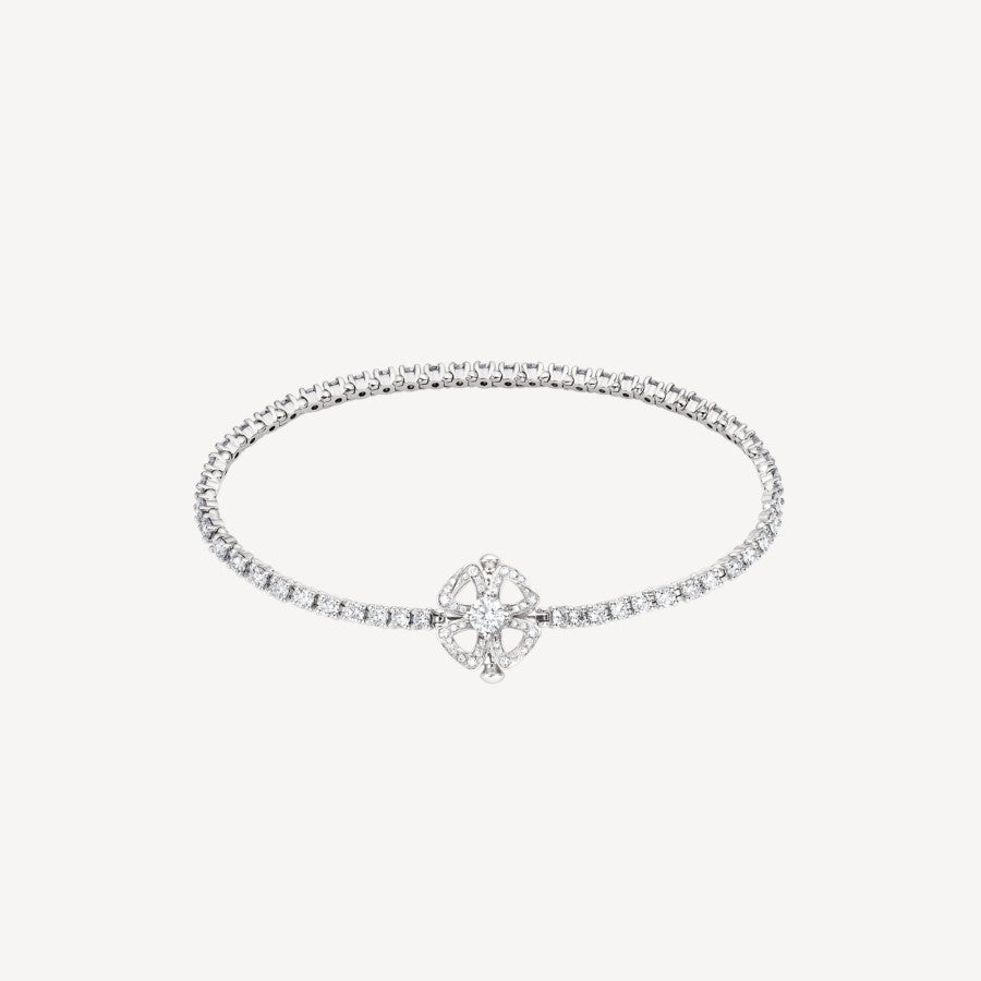 永遠の都ローマの驚異の中で咲き誇るフィオレヴァーは、ローマ人が幸福と喜びの象徴として大切にしていた魅惑的な四弁花からインスピレーションを得ています。普遍的な魅力を放つこのブレスレットは、時代を超越したダイヤモンドのテニススタイルと、花のモチーフがもたらす華やかさを絶妙に融合させています。18K