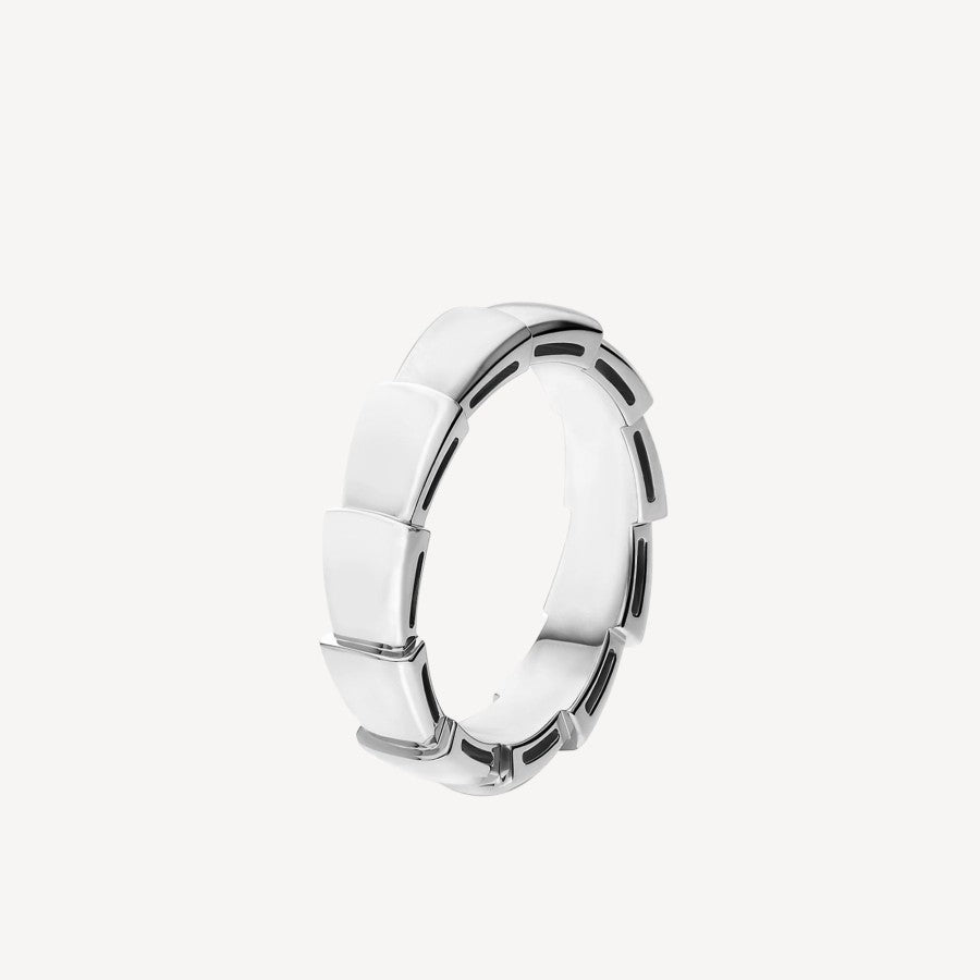 終わりなき変容と魅惑的な誘惑の象徴、18Kホワイトゴールドのセルペンティ・ヴァイパー・ウェディングバンドは、抗しがたい官能性と催眠術的なデザインを融合しています。洗練されたグラマラスなこの厚めのリングは、その美しい鱗のように指に巻きつき、蛇の独特のしなやかさを彷彿とさせます。