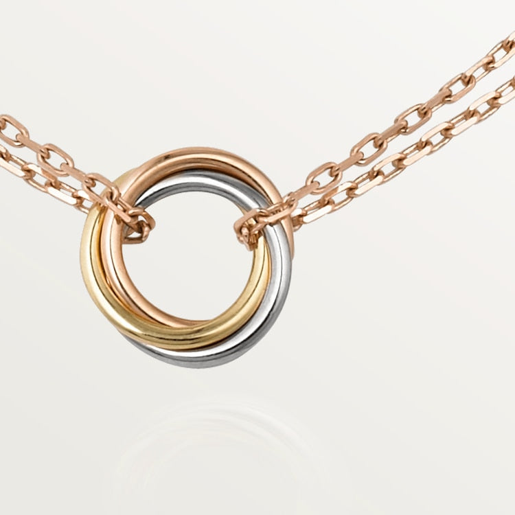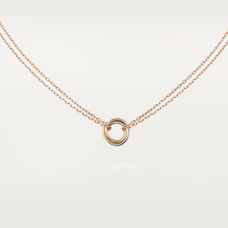 トリニティネックレス、18Kホワイトゴールド(750/1000)、18Kローズゴールド(750/1000)、18Kイエローゴールド(750/1000)、18Kローズゴールド(750/1000)チェーン。内径:7.3mm。サイズ:36-38-40。