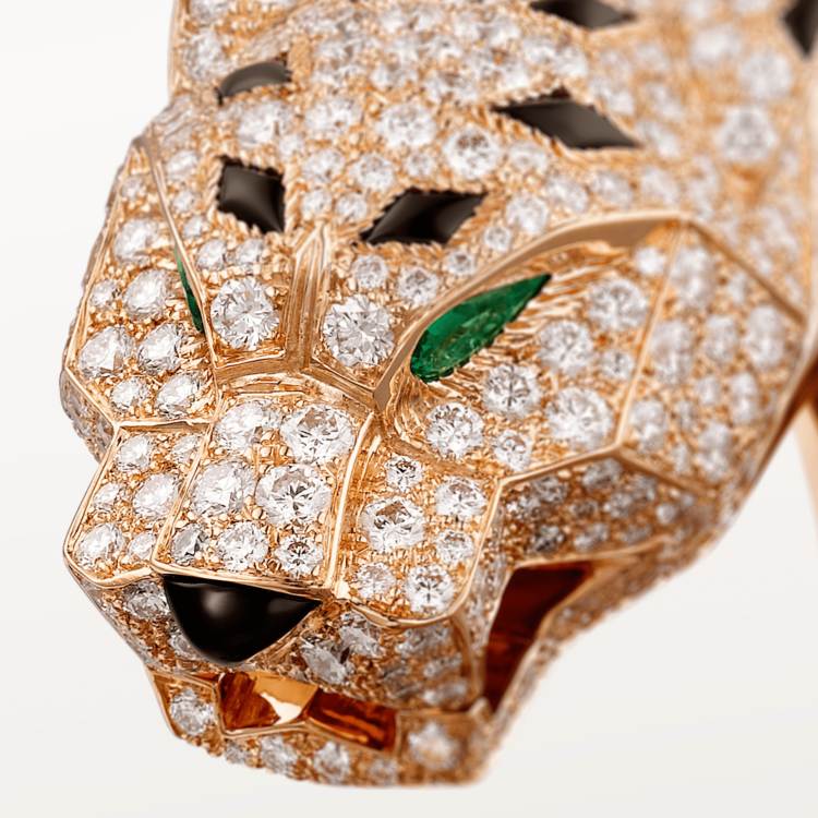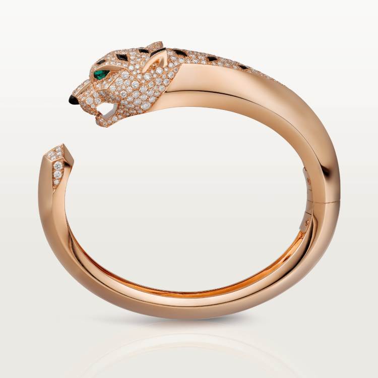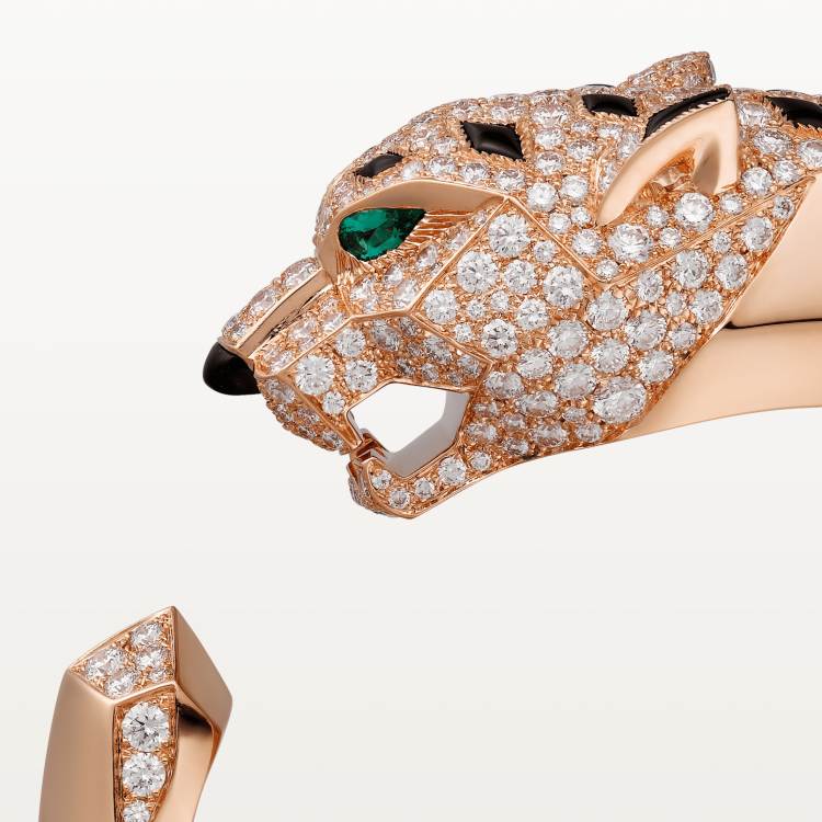パンテール ドゥ カルティエ カルティエ チーター ブレスレット、750‰ ローズゴールド、ブリリアントカット ダイヤモンド360個(総計4.33カラット)、エメラルド、オニキス。パターンの幅:18.3mm。パターンの長さ:14mm(サイズ17に対応)。