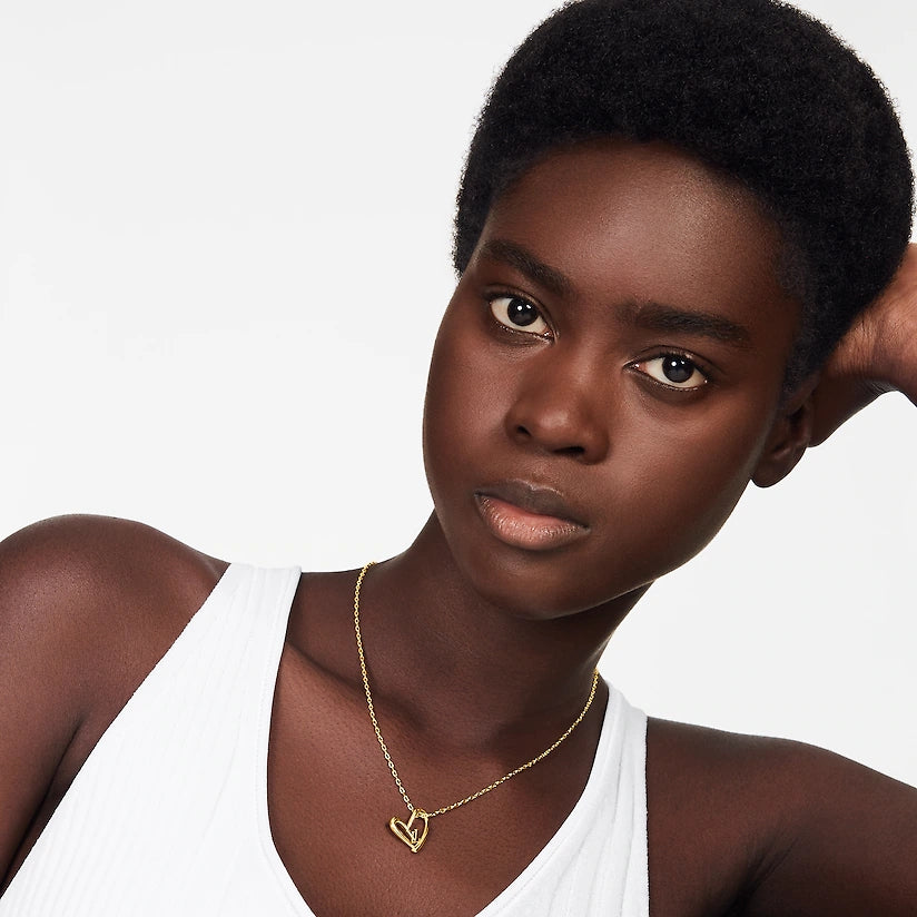 繊細な「フォール・イン・ラブ」ネックレスは、フェミニンな魅力を放ちます。細身のチョーカーチェーンに、首のくぼみにぴったりとフィットするよう考え抜かれたハート型のチャームが吊り下げられています。チャームの中央にはLVイニシャル、チェーンにはLVサークルペンダントなど、メゾンの象徴があしらわれています。