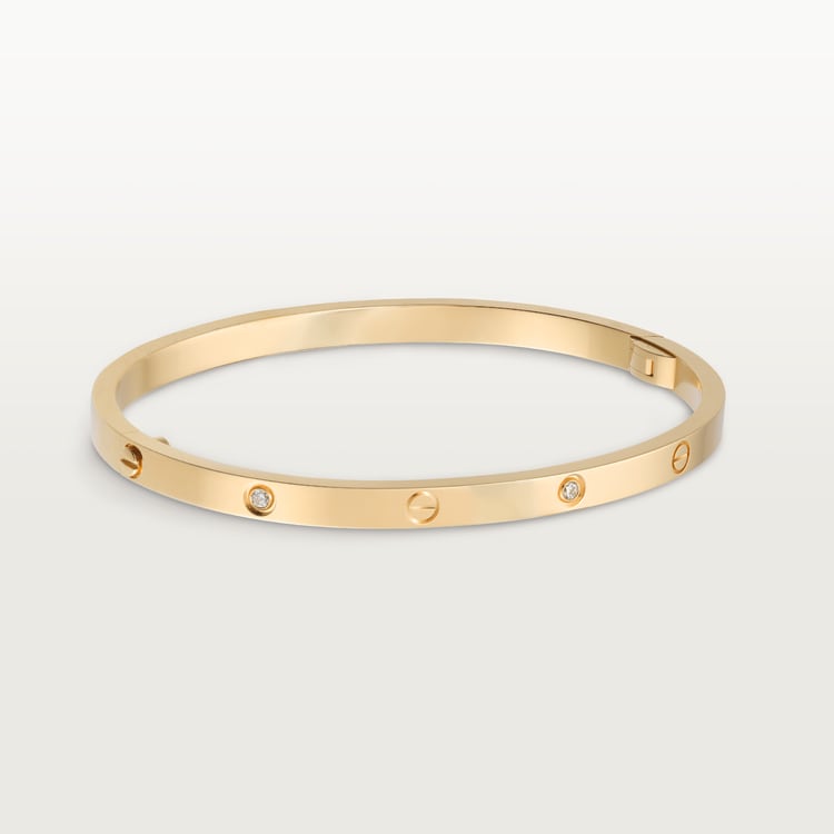 LOVEブレスレット、スモールモデル、18Kイエローゴールド(750/1000)、ダイヤモンド6個(合計0.15カラット)をセット。ドライバー付き。幅:3.65mm。厚さ:2.05mm(サイズ17)。象徴的なLOVEブレスレットは、1969年の創業以来、自由なスピリットを持つ愛のシンボルです。スクリューモチーフと定評のあるロック技術は、まさに時代を超越したデザインシグネチャーです。楕円形のシェイプは、手首にぴったりとフィットしながらも快適な装着感を実現します。ロック機構は、ブレスレットの片側に1つの機能的なネジ、もう片側にヒンジを備えています。すべてのLOVEブレスレットには、このブレスレットのために特別に作られたドライバーが付属しています。推奨されるLOVEブレスレットのサイズについては、ブレスレットサイズ表をご覧ください。きつめにフィットさせる場合はサイズに1cm、ゆるめにフィットさせる場合は2cm加えてください。