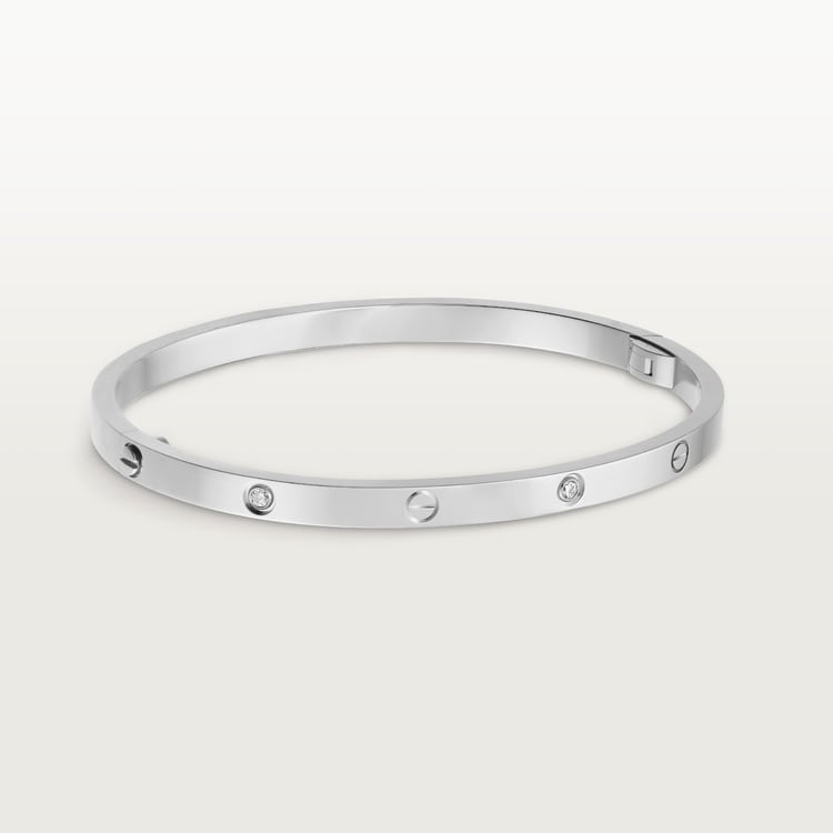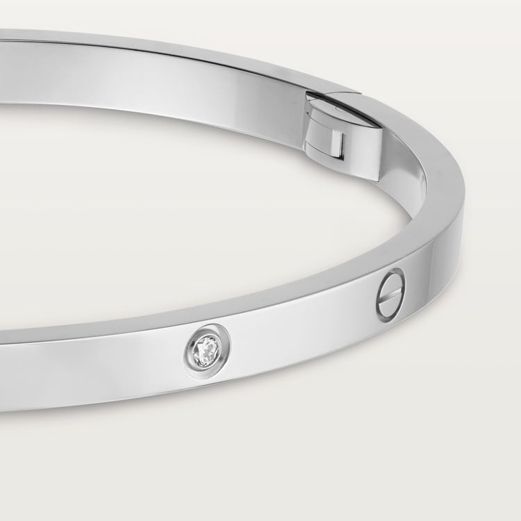 LOVEブレスレット、スモールモデル、18Kホワイトゴールド(750/1000)、ダイヤモンド6個(合計0.15カラット)をセット。幅:3.65mm(サイズ17)。ドライバー付き。厚さ:2.05mm(サイズ17)。アイコニックなLOVEブレスレットは、1969年の創業以来、自由なスピリットを持つ愛の象徴であり続けています。スクリューモチーフと定評のあるロック技術は、時代を超越したデザインシグネチャーです。オーバルシェイプは、手首にぴったりとフィットしながらも快適な着け心地を実現します。ロック機構は、ブレスレットの片側に1つの機能的なネジ、もう片側にヒンジを備えています。LOVEブレスレットには、それぞれ専用のドライバーが付属しています。推奨されるLOVEブレスレットのサイズについては、ブレスレットサイズ表をご覧ください。タイトフィットの場合はサイズに1センチ、ルーズフィットの場合は2センチ追加してください。ご注文いただいた作品のサイズによって、カラット重量、石の数、製品寸法が異なりますのでご了承ください。詳細については、