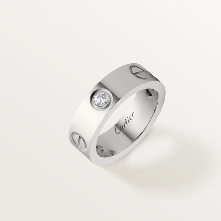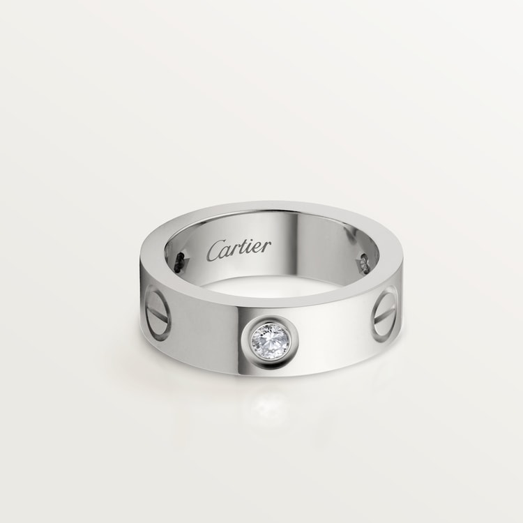 LOVEリング、18Kホワイトゴールド(750/1000)、ブリリアントカットダイヤモンド3個(計0.22カラット)をセット。幅:5.5mm(サイズ52)。