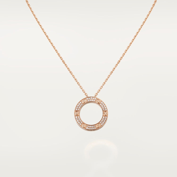 LOVE ネックレス、18Kローズゴールド(750/1000)、ブリリアントカットダイヤモンド54個(計0.34カラット)。内径15.95mm。チェーンの長さ:420mm。