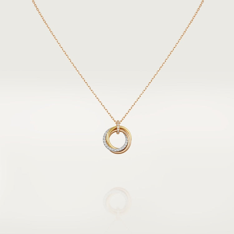 トリニティ ネックレス、18K ホワイト ゴールド (750/1000)、18K イエロー ゴールド (750/1000)、18K ローズ ゴールド (750/1000)、合計 0.20 カラットのダイヤモンド 33 個をセット、18K ローズ ゴールド (750/1000) チェーン。