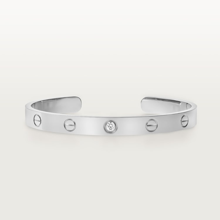 LOVEブレスレット、18Kホワイトゴールド(750/1000)、ブリリアントカットダイヤモンド1個(計0.10カラット)。幅:6.1mm(サイズ17)。